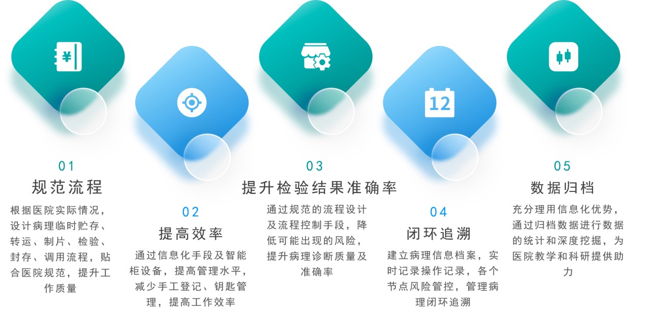 在每份标本上粘贴一枚耐化学药剂的RFID超高频电子标签,给每份标本一个具有唯一ID的身份标示,通过智能算法、信息交互接口、结合智能化设备,实现新鲜病理临时贮存安全管理,病理蜡块接收状态监控,病理蜡块取材制片质控管理,病理检验结果查询,病理蜡块快速查找调度,保证了病理标本的安全管理、提高了医护人员的工作效率、加强质量诊断控制和技术质量控制的管理,促进了医院数字化手术室建设。