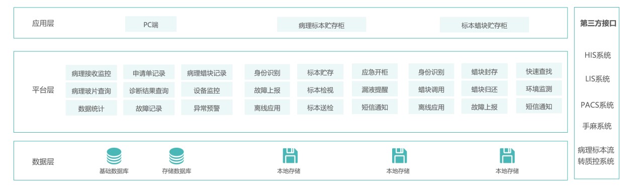 “应天海乐病理标本流转质控系统”,是针对临床手术及病理科从病理离体、临时贮存、制片、检验、封存这一整套业务流程,通过应用物联网RFID技术、条码识别技术、自动化控制技术等,与院内病理信息管理与质控系统结合,实现智能化的标本临时贮存、检视、送检、接收、制片、检验、图文报告管理、病理图像管理、封存、病理档案管理等功能。